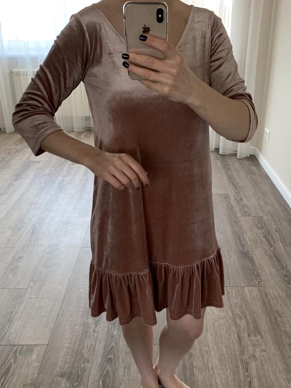 Велюрове плаття пудрового кольору з воланом. Має три маленькі дирочки, є фото. На тілі невидно.
