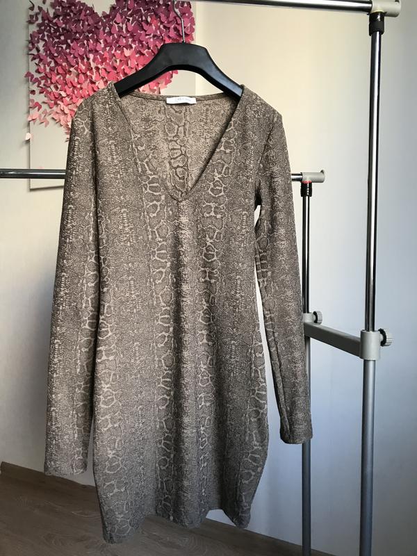 Платье в змеиный принт, ткань очень приятная. Сидит по фигуре и подчеркивает грудь.