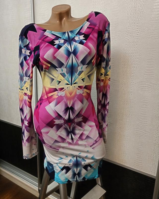 Мини платье в геометрический рисунок. Без бирок 44-46р Платье в обтяжечку. Тонкий трикотаж Тянется отлично Все мерки не растягивая ткань Длина от плеча 81см Плечи 40см Рукав 61см Ширина между подмышками 44см Пот 34-35см Поб 41-42см Тянется до 12см