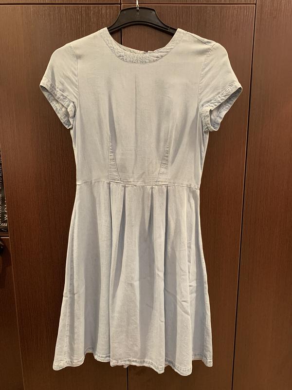 Платье женское, голубого цвета, тонкая джинсовая ткань, сзади на молнии, размер 36. Состояние идеальное! Без дефектов! Замеры: длина 98 см, плечи 39 см, пройма рукава 23 см, длина рукава 15 см, талия 35 см, длина от талии { юбка} 56 см.