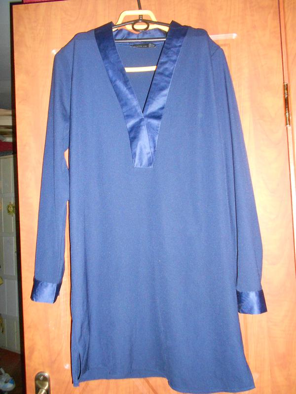 Платье Синего цвета. Фотоаппарат дает вспышку и платье кажется светлее. Атласные манжеты и треугольный вырез .