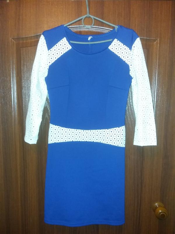 Платье, красивого синего цвета с интересными рукавами и вставкой на талии из белого кожзама. Цвет платья близок на последнем фото, не передается в идеале на фото.Размер около 42-46, но ориентируйтесь на замеры.Без дефектов и нюансов. Состав:95%полиэстр и 5%эластан. Замеры: длина от плеча - 87 пог - 40, тянется до 45 пот - 36, тянется до 40 побега - 44, тянется до 49 длина рукава - 45 Перед тем, как оформит заказ, читайте раздел,про меня".