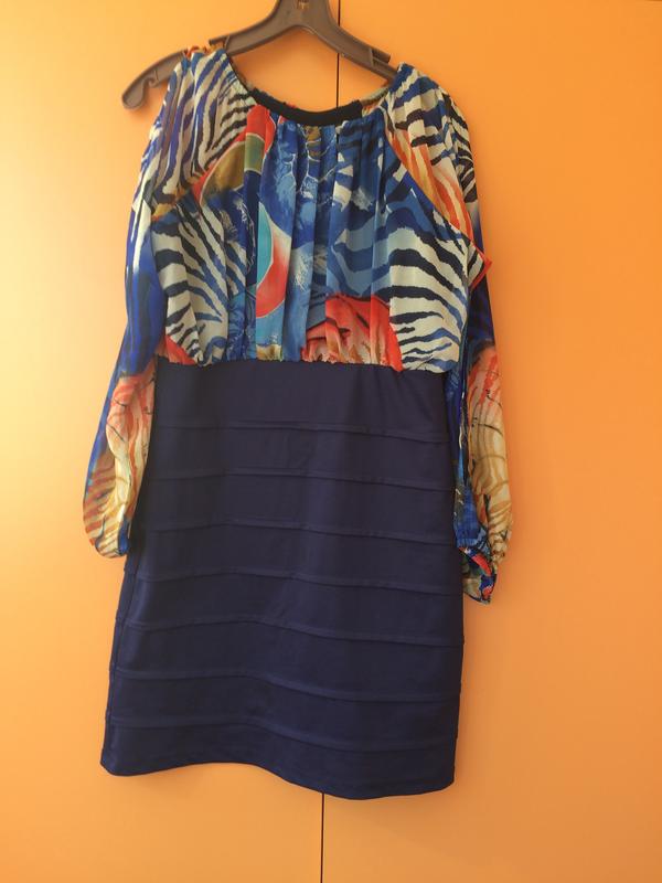 Платье. Очень стильное. Комбинированное. Верх- шифон цветной. Низ- плотный материал типа кримплина. Юбка прямая по фигуре. Кажется как будто юбка с блузой. Верх свободный. Очень красивый рукав. Размер 44-46. Доставка новой почтой