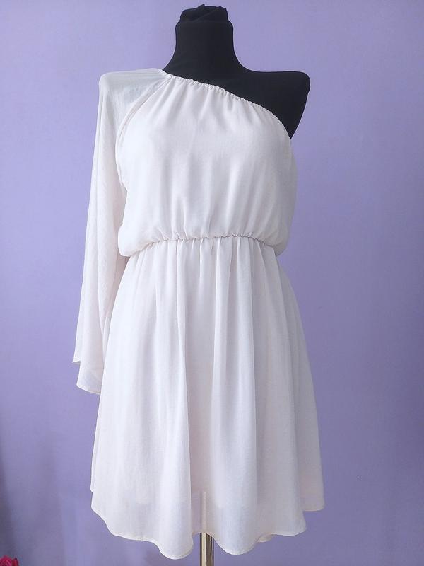 Легкое платье, асиметричного кроя. Длина 78 (61), в поясе полуобхват, резиночка 29 см, от подмышек 40 см, длина юбки 43 см.