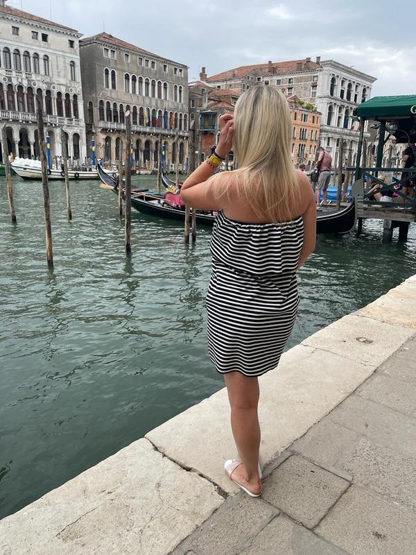 Літній варіант плаття від Zara. Плаття - резинка. Без шлейок, вдівається на круди. На фото 2 видно, що чорна резинка гарно облягає грудки, а зверху на неї спадає волан. Є 2 врізних кармана (всовуються в спіжничку). Платтячко справді дуже гарне.