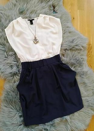 Сукня зверху на запах, на талії резинка, добре тягнеться, знизу вільного крою, з кишенями, трохи обьемными. Колір темно-синій знизу. Дуже стильно виглядає. Розмір XS-S. ідеально на S (36) , на XS - вільно