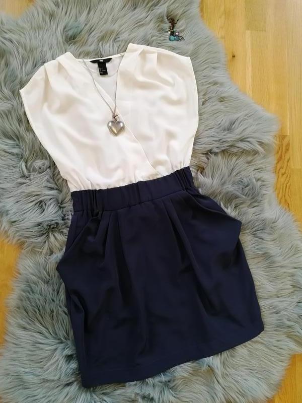 Платье сверху на запах, на талии резинка, хорошо тянется, снизу свободного кроя, с карманами, чуть обьемными. Цвет темно-синий снизу. Очень стильно смотрится. Размер XS-S. идеально на S (36) , на XS - свободно