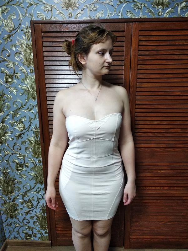 Платье коктейльное, мини, бежевое/персиковое, со вставками качественой эко-кожи на груди и по бокам. Сзади молния до талии. Тянется. 100% polyester. Размер L. Одевалось пару раз на вечеринки. Подходит как под высокий каблук, так и под сандалии.