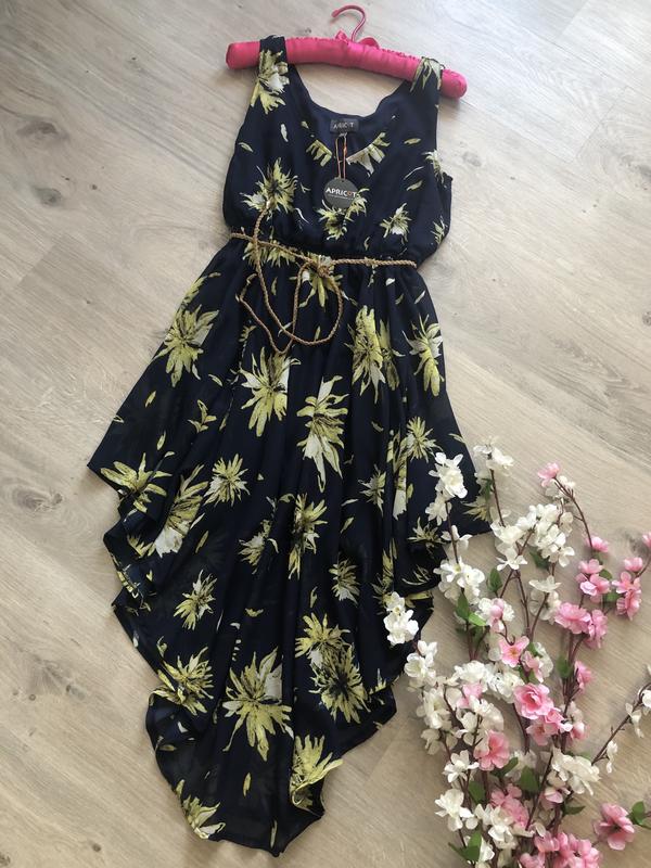 43. Стильное и очень красивое асимметричное платье. Размер указан UK 12 ( L) Подойдёт на S-M-L Цвет синий с очень красивым салатовым принтом - цветы. Ткань - шифон на подкладке. Платье асимметричное - с длинными углами. В комплекте кожаные поясок ( экокожа) Платье выглядит очень легко и стильно.