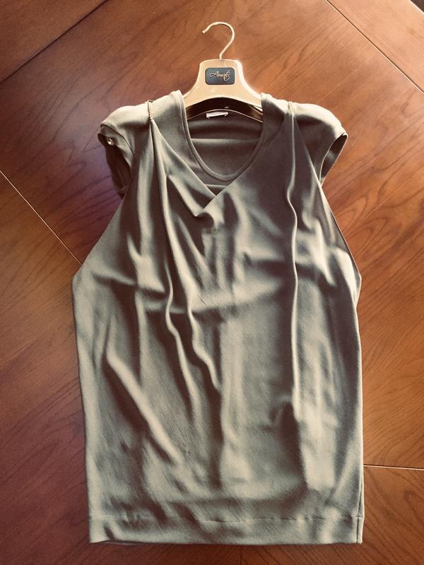 Два в одном - удлиненная футболка с туникой из натурального крепа. Модный цвет -хаки. Бретели туники выполнены из цепочек, которые фиксируются на плечах. Комплект можно носить как короткое платье, так и в сочетании с узкими брюками Длина футболки -72 см Длина туники - 81 см ПОГ футболки 35 см Плечо- рукав футболки 19 см Ширина от проймы до проймы туники 66 см Ширина низа туники 46 см