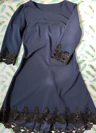 Стильное платье темно синего цвета с кружевом. Удлиненная задняя часть платья. Подойдет как для торжественных событий, так и для прогулки. Состояние нового (идеальный) Длина рукава 42 см Плечи 38 см ПОГ 44 см ПОТ 38 см Длина по спине 90 см Длина спереди 84 см