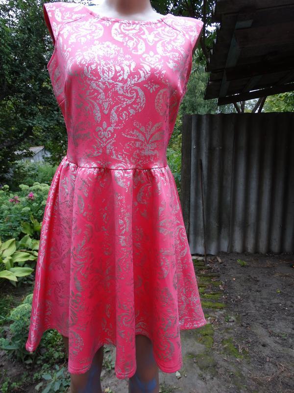 Шикарное розовое платье с блестящим узором, очень красиво переливается, выглядит нарядно, подойдет на прохладную погоду, ткань не легкая, можно будет носить под пиджак или куртку или вечером отличный вариант