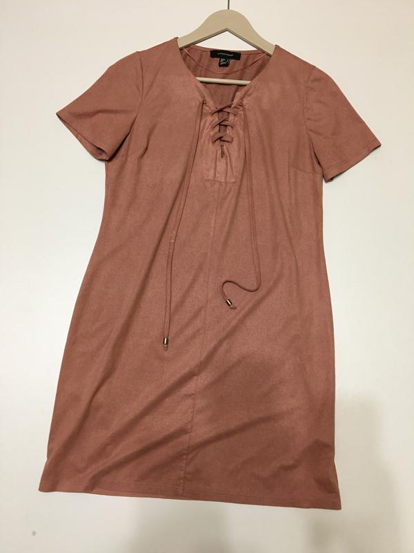 Стильне плаття з шнуровкою ,в дуже гарному стані, тканина «під замш», 86% поліестер,14 еластан, (колір як на манекені).Розмір uk 6 eur 34. Заміри : ПОГ 44, ПОТ 41, ПОБ 46, довжина 82см.