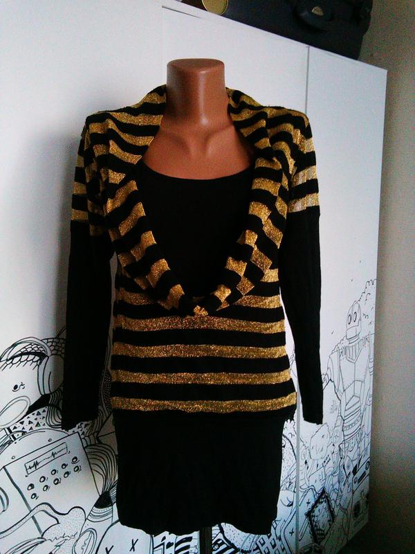 Эффектное платье-туника с золотистым рисунком-полоской. 2-х слойное:под низом идет майка(пристрочена), сверху- золотистый полупрозрачный джемпер с воротником-хомутом. Длина верхней части -49 см,юбка трикотажная приточная часть- 66 см( ееширинаПОБ 41 см-тянется),ПОБ груди - 46 см,плечико-6 см,длина рукава - 52 см. марка:Dore Garage