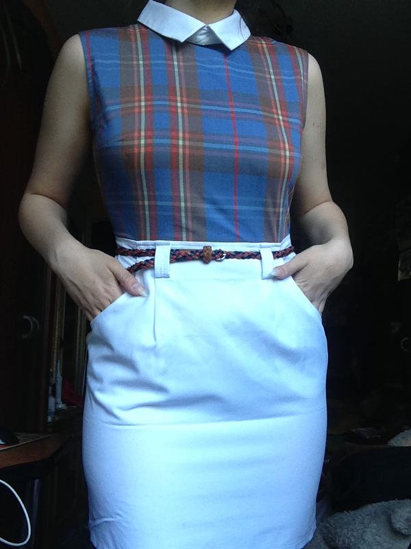 Платье. До пояса в клеточку, низ-белый. Размер на бирке указан 46. Сидит на М и L.Тянется. Длина до середины бедра. Все замеры предоставлю по запросу.