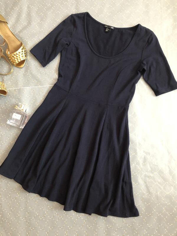 Повсякденне, темного синього кольору плаття, короткий облягаючий рукавчик, спідниця - кльош.