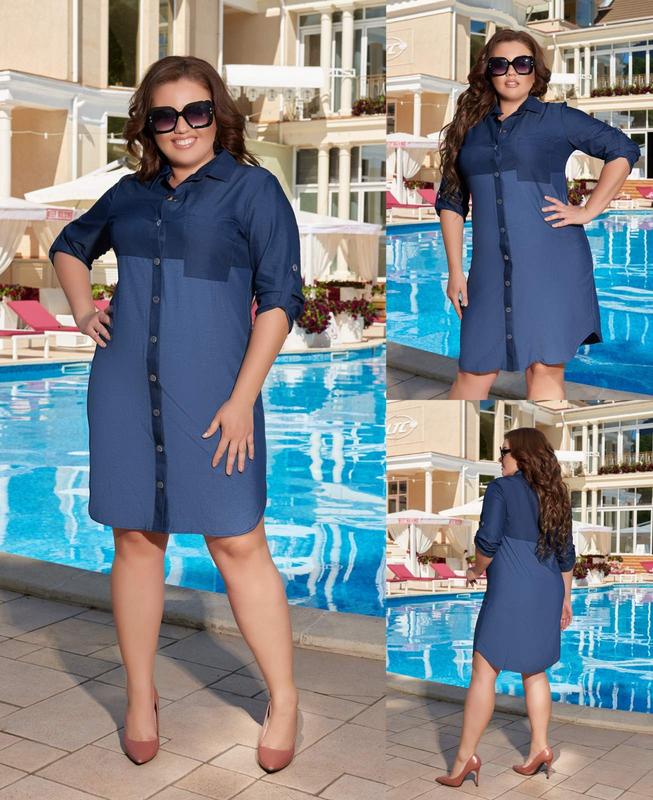 предоплата 100% Платье elis Модель : 4085 - Размеры: 50,52,54,56 - Длина изделия: 98 см (от плеча по спинке) - Рукав: короткий (34 см) - Материал: тонкий джинс - Цвета: голубой, синий, марсала - Цена : 460 грн - Платье халат из легкой джинсовой ткани, планка с пуговицами спереди и накладной карман на груди, Фиксатор длины рукава, отрезная талия