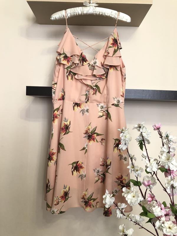 228. Красивое и нежное летнее платье. Размер идёт на L и на не полный XL. На бирке указан UK 14, EUR 42 ( XL ) На спине платье идёт с красивым v-образным вырезом. На груди тоже v-образный вырез с переплетом. Цвет персиковый с красивыми цветами. Состояний идеальное!