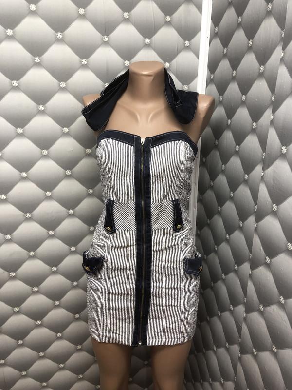 Гарна міні сукня . Без бретелей,але є під них петельки. Стан добрий. Не вистачає хвостика на собачці від замка. Є плямка. Видно на останньому фото . Дивіться виміри. Довжина 61 см ПОГ 38.5 см ПОТ 32.5 см ПОБ 44 см