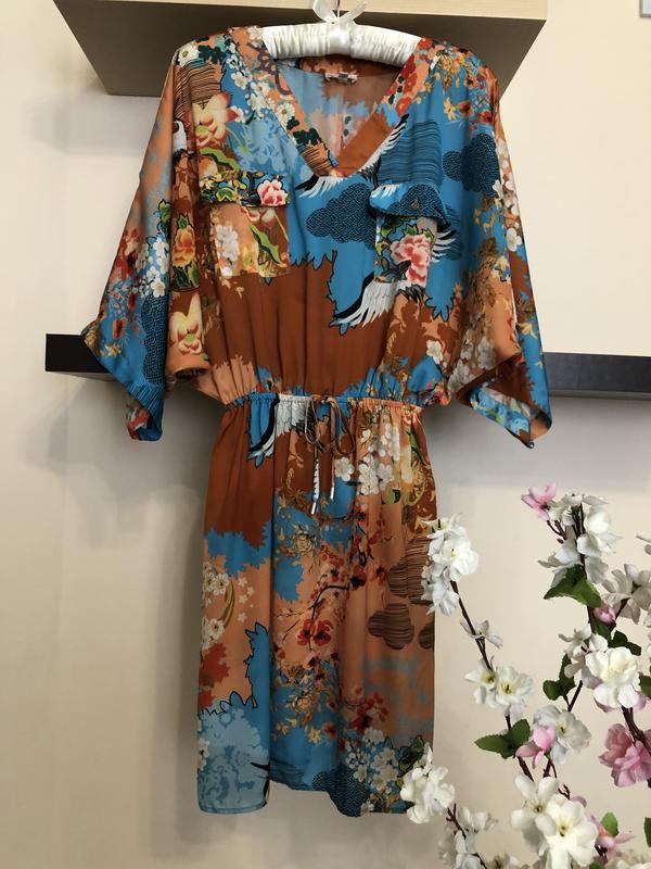 Классное платье!!! Бренд River Island Размер указан 10 ( M ) Супер красивое сочетание оранжевого, голубого и других цветов. Красивый, нежный и очень «добрый» принт ( аисты, цветы)) Верх платья идёт «летучая мышь». Красивые широкие рукава. Платье с V- образным вырезом. На груди есть два кармана на пуговичках. Талия идёт на резинке. На юбке по бокам есть карманы.