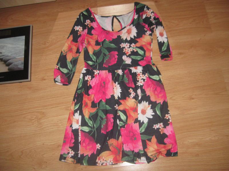 Красивенное платье в цветы, смотрится обалденно, длина 90см пог-42см но тянется, пот 33-40см, рукав 39см.
