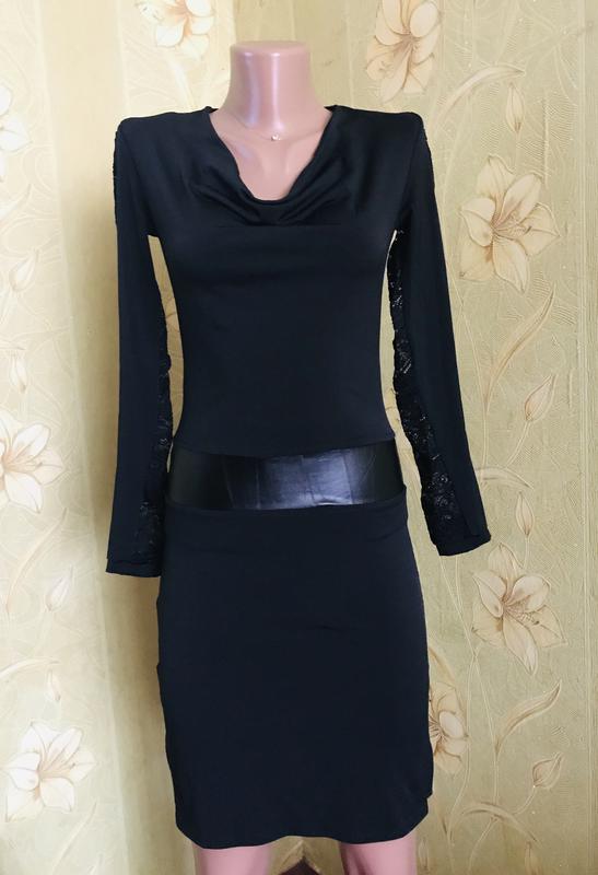 Красивое чёрное платье,спина и рукава ззади гипюровые,пояс выделен кожзамом,материал 70%котон,30%полиэстер,тянется очень хорошо.