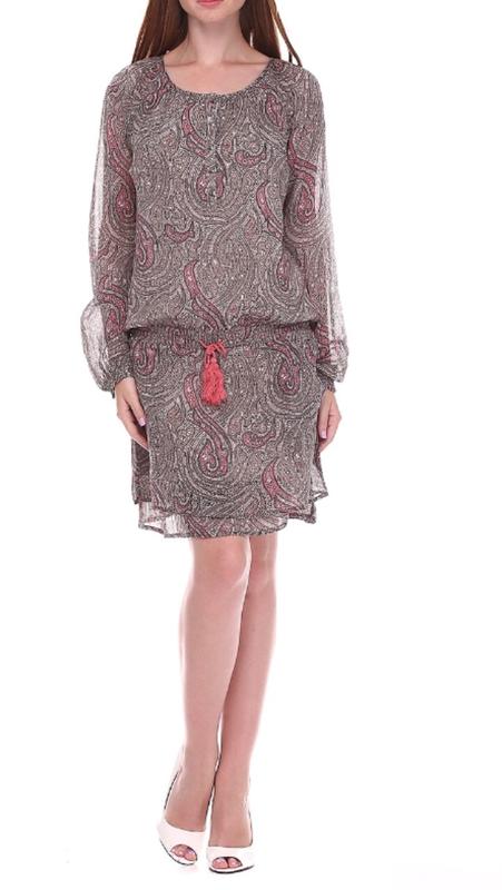 Платье с круглым вырезом горловины, застёжка на пуговицы, по линии талии резинка и кулиса, спереди два прорезных кармана, рукав длинный, манжет на резинке