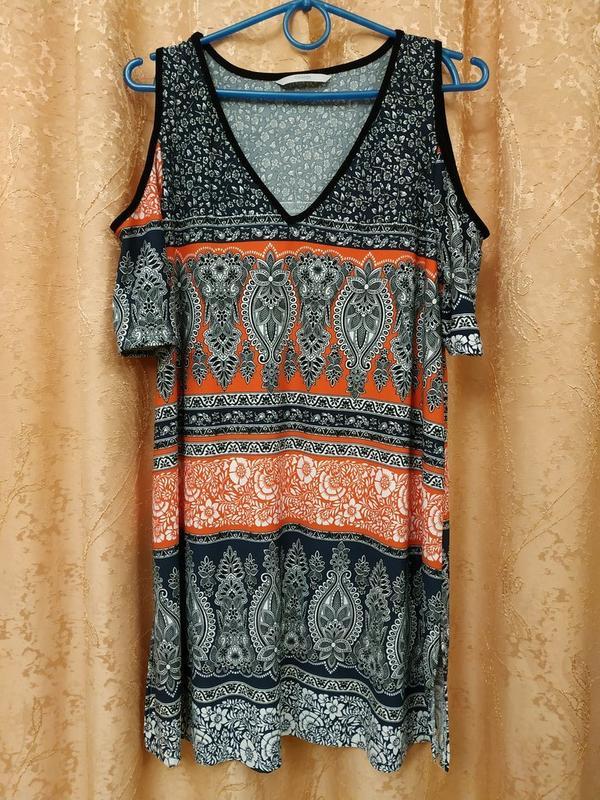 Очень красивое платье Яркая расцветка , открытые плечи, по бокам разрезики Ткань мягенькая, тактильно очень приятная 95% полиэстер и 5% спандекс Я очень люблю эту ткань, так как летом в ней совсем не жарко И очень удобно )) На девушек , чей рост выше 171 см отлично будет как туничка Хорошо будет смотреться и с джинсовыми шортами, бриджами, джинсовой юбкой или даже с джинсами) Даю замеры, а Вы уже смотрите сами)) Фасон свободный пог 49 поб 53 см ди 78.5-79 см Длина боковых разрезов 23 см Состояние новой вещи Не ношено Сток