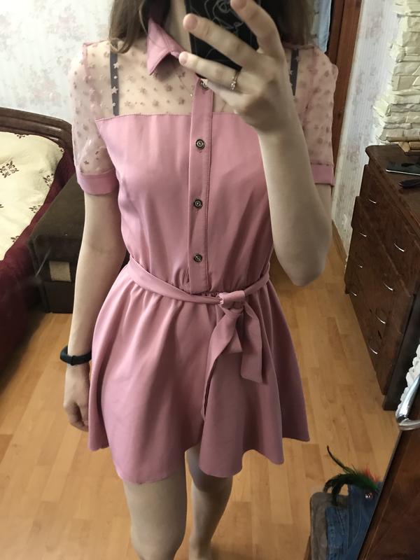 Летнее розовое короткое платье на пуговицах с прозрачными вставками с поясом