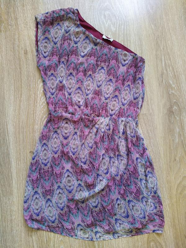 Лёгкое платье на подкладке. размер L,на одно плечо, рост 170, полиэстр, от 37 см, от плеча до талии 40 см, от талии до низу юбочки 44 см