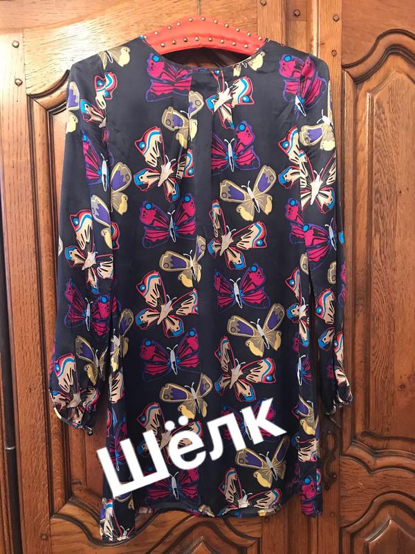 Стильный дизайн платья известного бренда. Крой-свободный. Бирка есть основная,с составом отрезана. Материал-100%шелк,Непросвечиваеться. Размер хс-подойдёт на 34-36 И даже на небольшой 38 Меряйтесь по замерам Длинна 82 Плечи 33 Рукав 61 Пог то47 до 50 Пот от47 до49 Поб 56 Основной цвет -граффити (темно-серый) Состояние отличное,небольшой дефект шва сзади (фото)