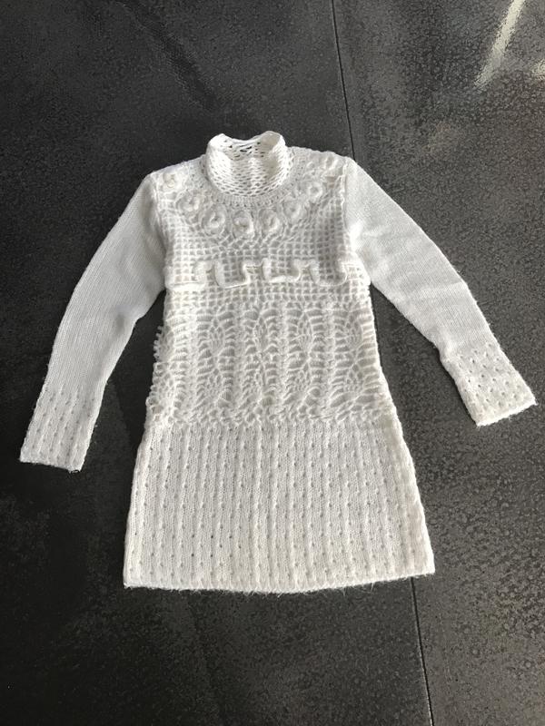 Очень тёплое вязаное шерстяное платье. Горловина сзади на завязках. К шерстяной нитки добавлена люрексовая нить, которая переливается на свету светло зелёным цветом. Замеры: ОГ 42, ОБ 48, длина 78, рукав 55.