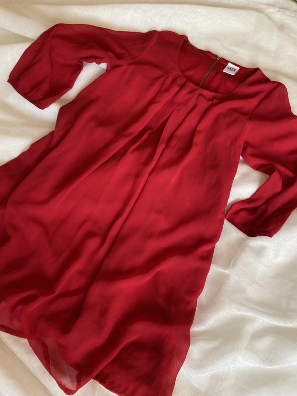 Елегантне плаття червоного насиченого кольору, на розмір С підійде ідеально. Фасон А-силует, вільне, з защипами на горловині, довжина вище коліна, з замочком ззаду. Тканина - під шовк + на підкладці. Виглядає дуже стильно.