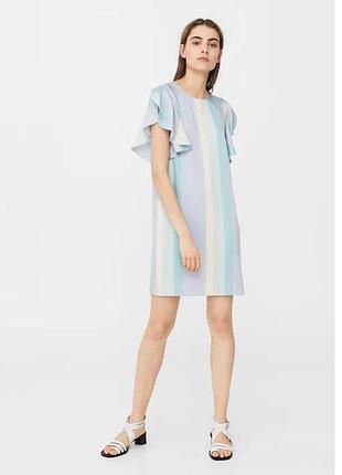 Прямой фасон. Принт в полоску. Круглый вырез горловины. Сзади застежка в форме слезы. Короткие рукава "летучая мышь". Рукава с воланами. Подкладка. https://shop.****************************************************************************************** ПОГ 42, длина 85см.