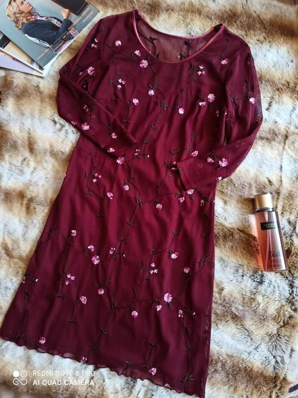 Красивое праздничное платье-сетка с вышивкой. Свободного фасона. Цвет марсала. Размер не указан (идет на S). Верх мелкая сетка с вышивкой. Низ на подкладке. Рукав три четверти. Материал: полиэстер/полиамид. Состояние новой вещи. Дополнительные фото и замеры снаряжения.
