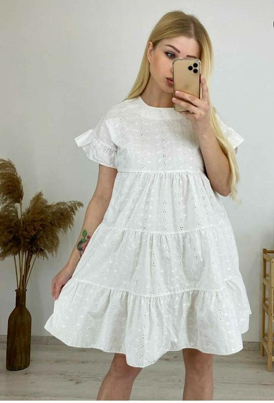 Легенька біла сукня - зефірка. Підійде під будь-який тип фігури. Буде актуальною у літню спекотну погоду. В наявності декілька розмірів. Розмір 4 (32). Напівобхват грудей - 47 см., напівобхват талії - 58 см. Довжина - 82 см. Розмір 6 (34). Напівобхват грудей - 49 см., напівобхват талії - 58 см. Довжина - 82 см. Розмір 12 (40). Напівобхват грудей - 52 см., напівобхват талії - 67 см. Довжина - 86 см.