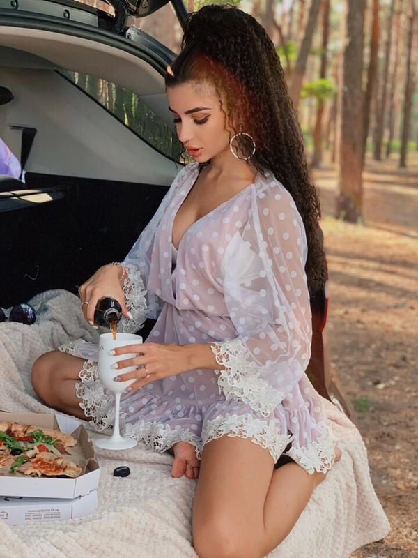Легкое летнее платье из сетки горох на подкладе из микромасла с глубоким декольте , отделка из хлопкового макраме 💗🎀очень нежное и романтичное 💞 Размер универсальный {42-46}