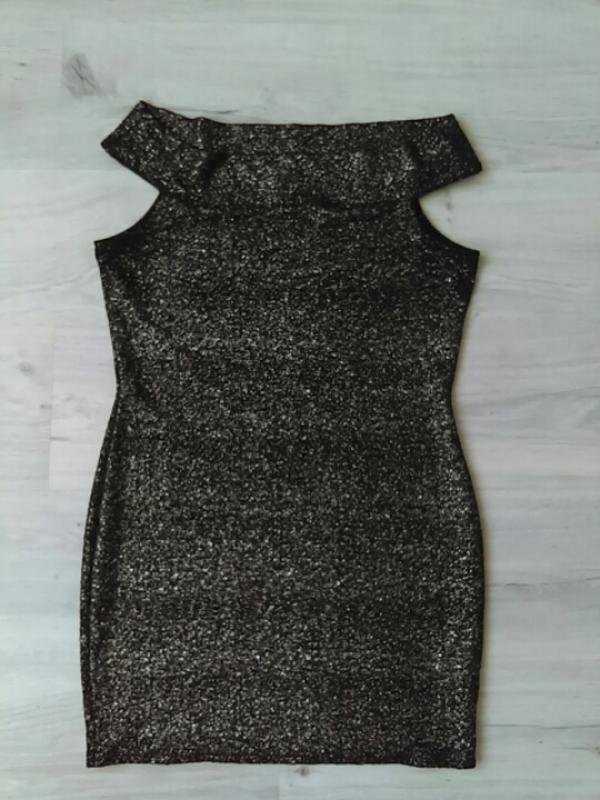 очень красивое, черное с блестками, ткань тянется и идеально подчеркивает фигуру. на размер 48. Плечики приспущены.