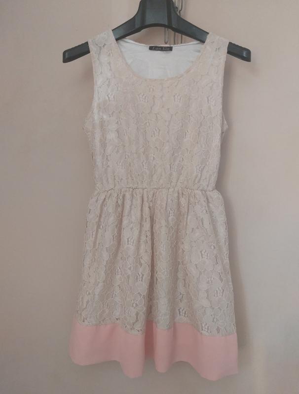 Красиве мереживне плаття бежевого кольору, знизу шифонова вставка персикового кольору, є підкладка. ПОГ 45 див. ПІТ 29 див. гумка тягнеться до 41 див., спідниця вільного крою. Довжина 76 див.