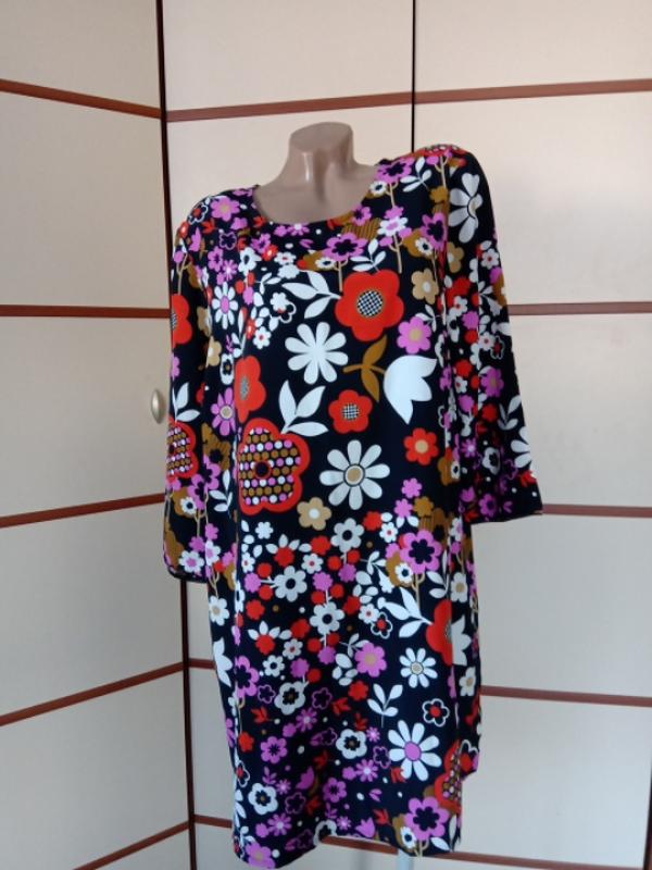 Яскраве плаття розмір XL-XXL (вказаний 18),довжина 88см,довжина рукава 47см,пог 56см,поб 63 см,бірки із складом тканини немає,подібне на поліестер,легеньке ,приємне на дотик.