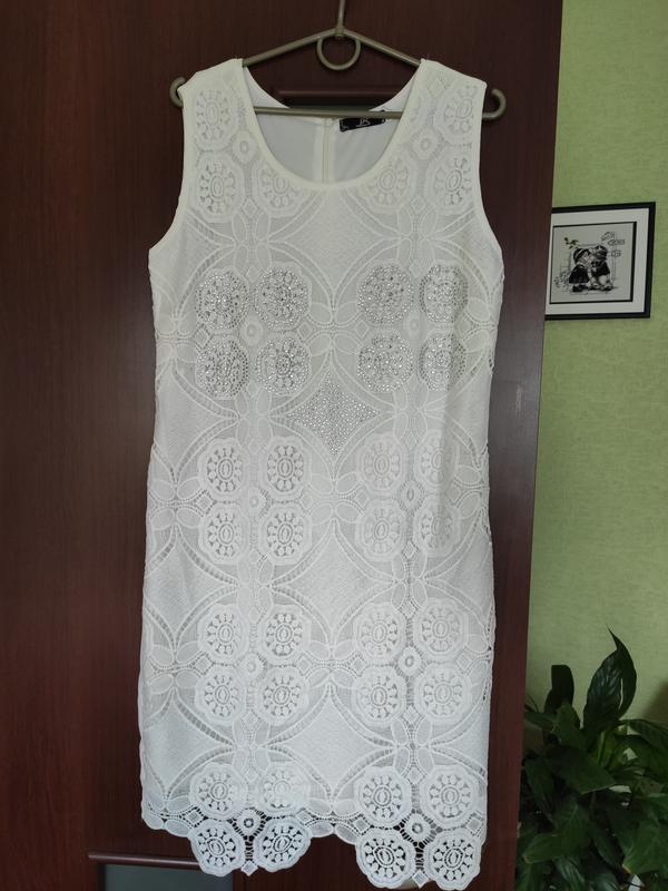 Красивое белое лёгкое летнее платье. Свободное. Все камушки на месте. Змейка сзади. Идеальное для торжества. Не светится. Есть подклад. Размер на бирке ХL. Длина 93, ширина по спинке 46-47, плечи 37. Ещё фото или вопросы пишите.