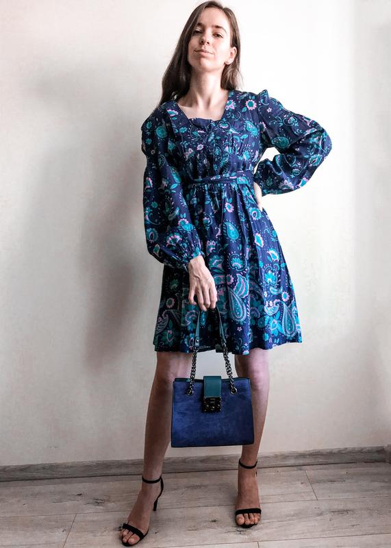 Ідеальний стан. Красивий принт та крій. Є поясок, вже пришитий до сукні. Натуральний матеріал, який не буде парити влітку. Заміри глибина декольте 18 довжина 93 ОГ 92 ОТ 87 ширина внизу 177 плечі 38 рукав 59 Сумка з фото ПРОДАНА.
