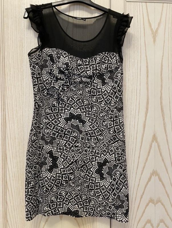 Продам сукню британського бренду Oasis в розмірі XS, але підійде і на невеличку S. Дуже красиве, верх-тонка сіточка, на рукавах - прикраса з сітки теж. Спереду на грудях декоративне драпірування з основної тканини. Основна тканина - ацетат, з принтом, є підкладка з натурального шовку. Збоку потаємна блискавка. Стан відмінний, носилось мінімально. На зріст 164 трошки вище коліна довжиною. Загальна довжина виробу 85 см, НОГ - 43 см (напів обхват грудей), НОС - 45 см (напів обхват стегон).