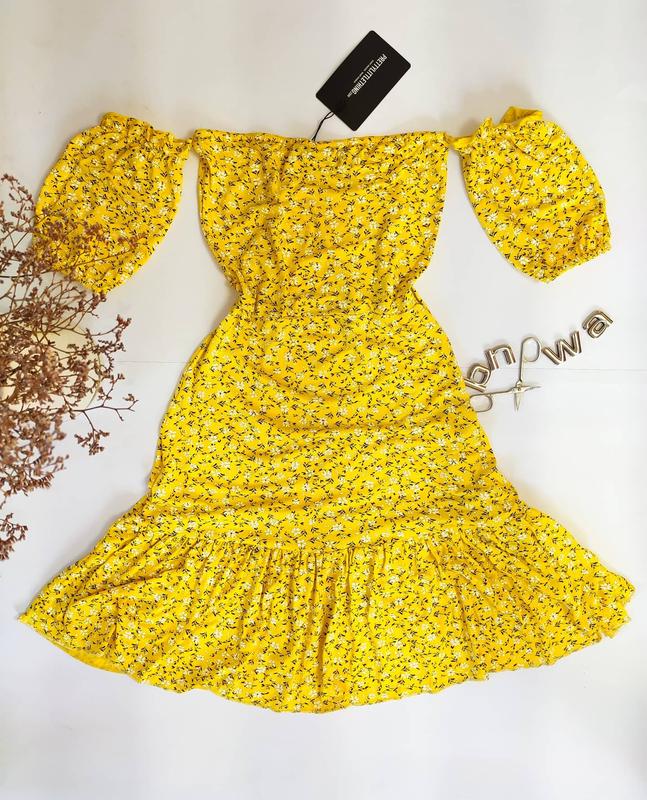 Жёлтое платье в цветочный принт с открытыми плечами