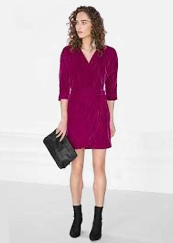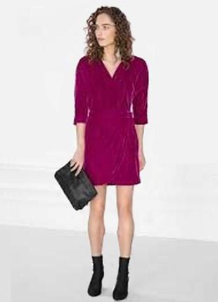 бархатное платье с запахом от бренда & Other Stories разм. 32 № 0344542005 Мерки: пог 45см, пот 33см, длина 89см Бархатное платье с запахом и на поясе; v-образный ворот; длина рукава - 3/4. Цвет: малиновый Состав: 100% полиэстер; подкладка: 100% полиэстер