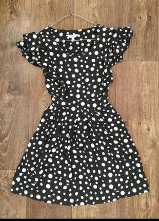 Продам милу сукню в горошок. На грудях прикрашено воланом, який переходити в рукав. ПТ 40 см (ззаду регулюється пояском) ПГ 46 см Довжина від талії 50 см Збоку блискавка. Тканина досить щільна-не просвічує.