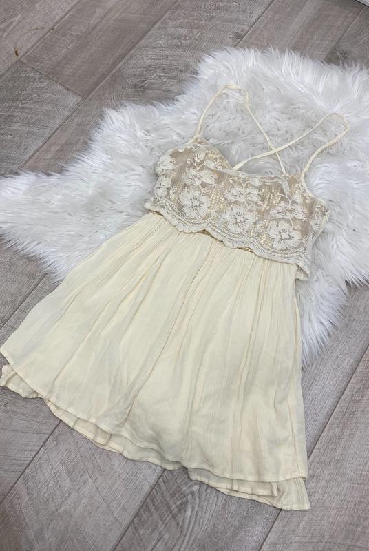 Бретели сзади перекрещены, спереди под тканью пайетки, скрыта молния сбоку, юбка двойная не просвечивает.