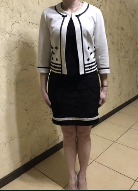 Стильный костюм-чёрное платье со светлым пиджаком Белорусского производства. Материал тянется, осень приятный к телу, легкая ткань на подкладке. Пиджачок очень дополняет образ плюс поможет в прохладную погоду. Данный костюм уместен как наряд на события, так и деловые встречи. Длина платья 90 см.