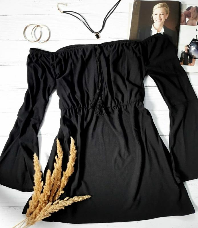 Чорне плаття з відкритими плічками і довгим розкльошені рукавом. Матеріал тягнеться добре. Розмір 10. Напівобхват грудей - 48 див. Напівобхват талії - 42 див. Напівобхват стегон - 57 див.
