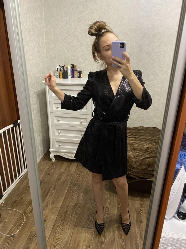 Чёрное платье в блестках ( блестки не осыпаются ) не трёх кнопочках плюс пояс Красиво переливается , на подкладке ( типа удлиненного пиджака ) Размер m Сидит идеально Покупала в манго за 2000 грн ( Надела 1 раз )